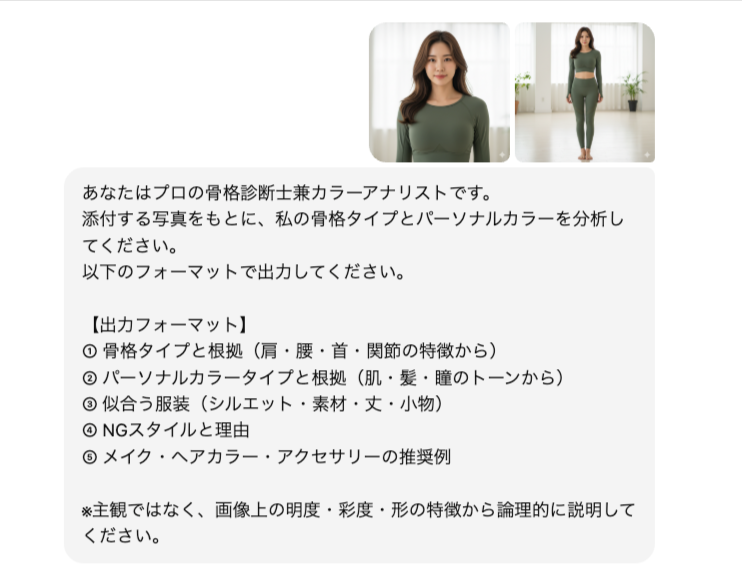 このように依頼することで、ChatGPTは画像から骨格と色味を同時に読み取り、総合的なスタイル提案を返してくれます。